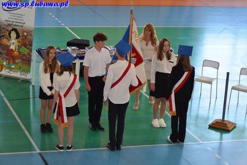 Po odśpiewaniu hymnu nastąpiło uroczyste przekazanie sztandaru nowemu pocztowi – uczniowie klas ósmych mieli zaszczyt przekazać uczniom klas siódmych, swoim następcom, sztandar i zobowiązali ich do godnego reprezentowania szkoły. Nowy poczet ślubował dbać o dobre imię szkoły i uczciwie spełniać swoje obowiązki uczniowskie, pracować nad doskonaleniem swojego charakteru, odważnie przeciwstawiać się złu, a zdobytą w szkole wiedzę i umiejętności wykorzystywać w pracy dla naszej Ojczyzny.