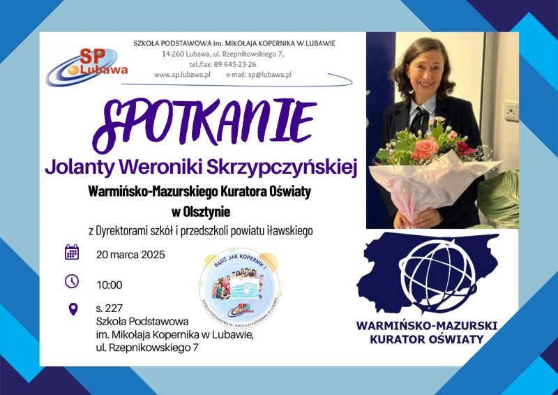 Z inicjatywy Rady Dyrektorów Szkół Podstawowych przy Warmińsko-Mazurskim Kuratorze Oświaty , której członkiem jest Dyrektor szkoły Mirosław Kowalczyk w dniu 20 marca 2025 r. w lubawskim Koperniku odbyło się robocze spotkanie Jolanty Skrzypczyńskiej Warmińsko – Mazurskiego Kuratora Oświaty w Olsztynie, Teresy Bednarz Dyrektor Delegatury Kuratorium Oświaty w Elblągu, Wizytatorów Kuratorium z Dyrektorami szkół i przedszkoli powiatu iławskiego.
