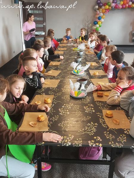 Nie zabrakło również kreatywnych warsztatów cukierniczych. Uczniowie mieli okazję samodzielnie ozdabiać mazurki i babeczki, wykorzystując kolorowe lukry, posypki i różnorodne słodkie dodatki. Każde dziecko stworzyło własne, niepowtarzalne wypieki, które z dumą zabrało ze sobą do domu.