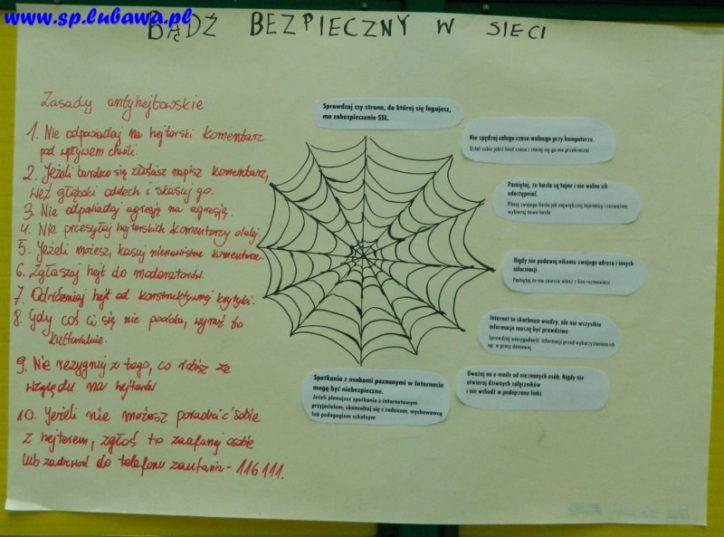 Od 06.11.2017 do 13.11.2017 uczniowie klas II E oddziału gimnazjalnego przeprowadzili mini akcję profilaktyczną pod tytułem Bezpieczeństwo w sieci. Pod opieką wychowawcy – Katarzyny Trzeszewskiej oraz pedagoga szkolnego – Małgorzaty Niedźwieckiej, przygotowali plakaty dotyczące zagrożeń jakie pojawiają się w Internecie we współczesnym świecie. Dwie uczennice przygotowały kilkuminutową prezentację i przedstawiły ją w kl. VII SP dotyczącą netykiety, prawnych konsekwencji cyberprzemocy oraz podały kilka przykładów z życia do czego mogą prowadzić działania związane na przykład z hejtem.