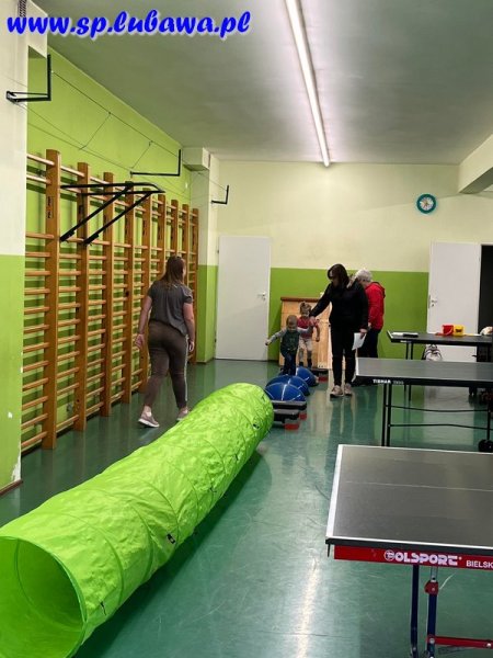 W jednej z sal sportowych szkoły odbywały się gry i zabawy ruchowe. Dzieci z wielkim zaangażowaniem pokonywały tor przeszkód. Przechodziły przez tunel, robiły ślizgi na ławeczce, następnie wykonywały skoki na leżącej na podłodze drabince, hula- hopach i wyspach. Próbowały również sił w grze