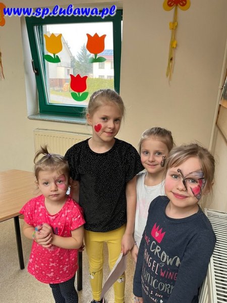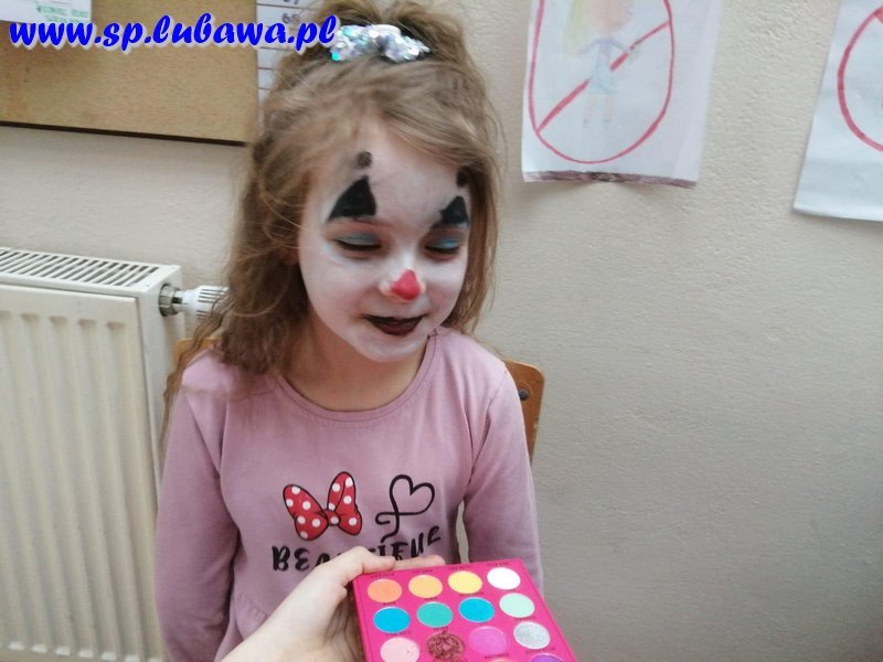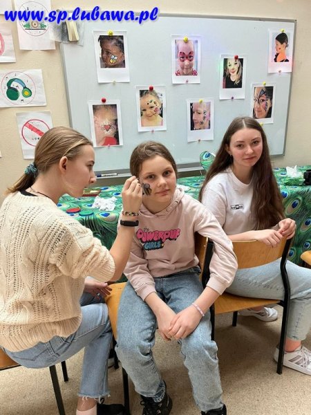Dużym zainteresowaniem cieszyło się malowanie twarzy. Kolorowe malowidła wykonywały uzdolnione artystycznie uczennice z Samorządu Uczniowskiego pod opieką opiekunów.