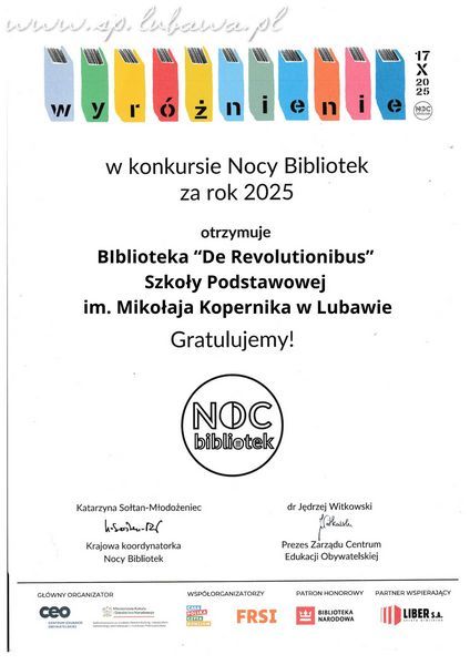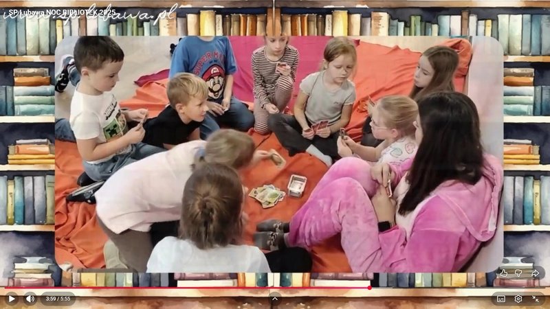 Nasza szkoła wzięła udział w ogólnopolskiej akcji Noc Bibliotek 2025, która w tym roku odbyła się pod hasłem „Do dzieła”. Noc Bibliotek to wyjątkowe wydarzenie promujące czytelnictwo i pokazujące bibliotekę jako miejsce twórczych, inspirujących i atrakcyjnych działań dla dzieci i młodzieży. Organizatorkami wydarzenia były nauczycielki: pani Walentyna Miszczak oraz pani Marta Szulc. W akcji uczestniczyli uczniowie klas 2–7.