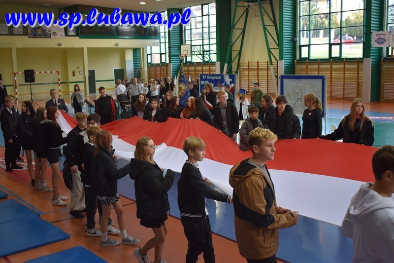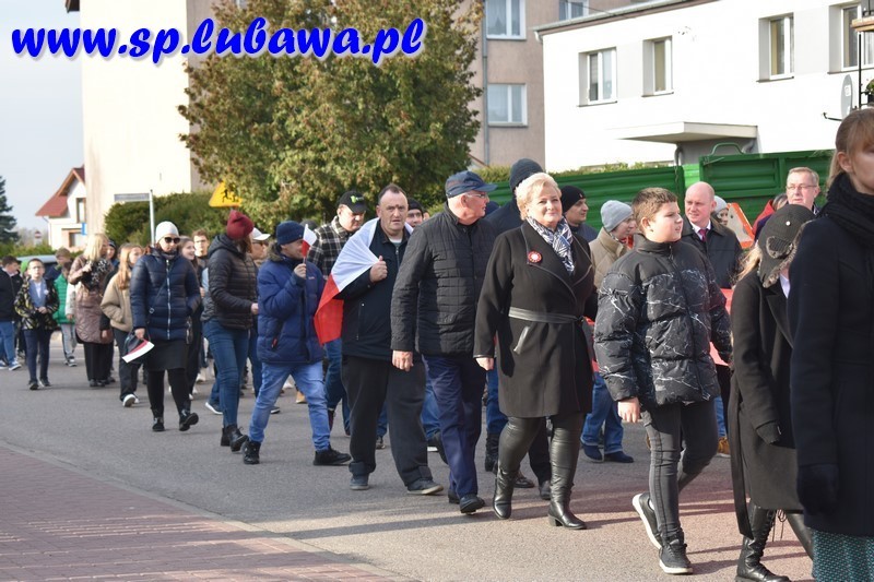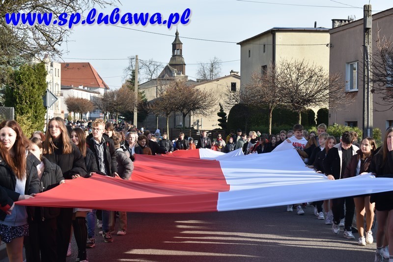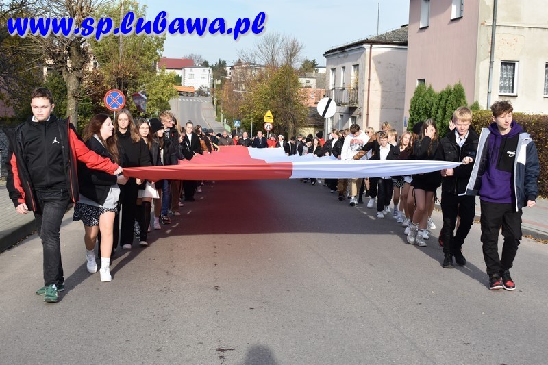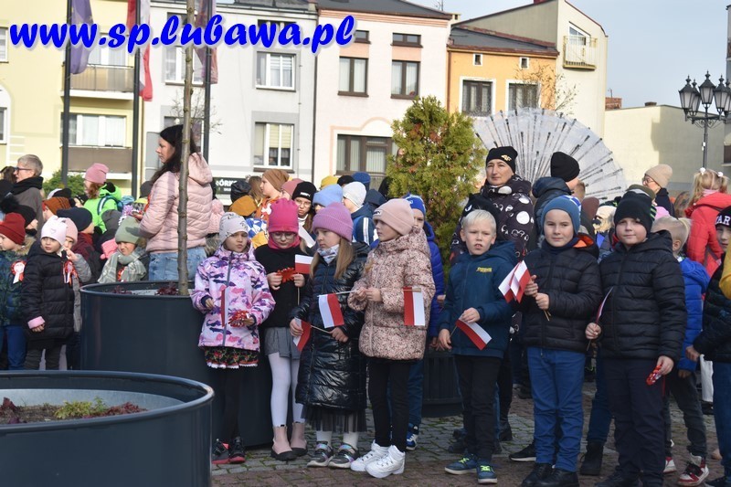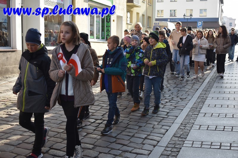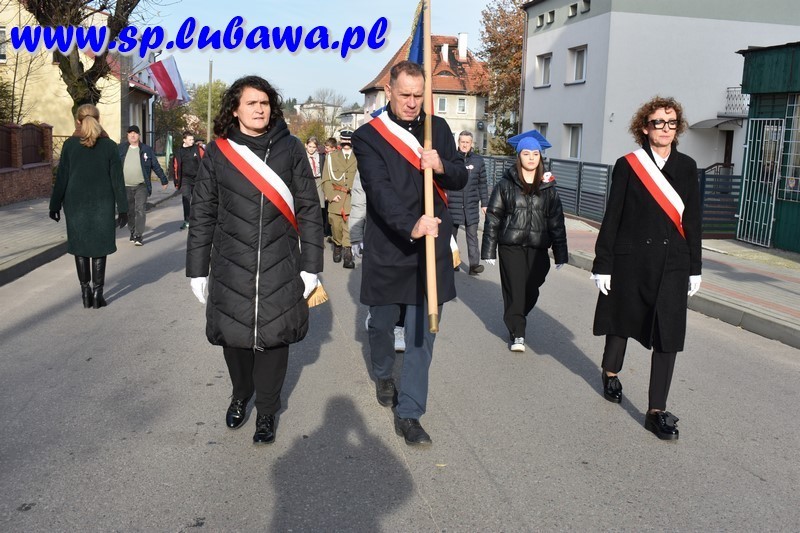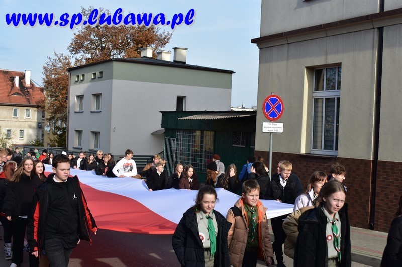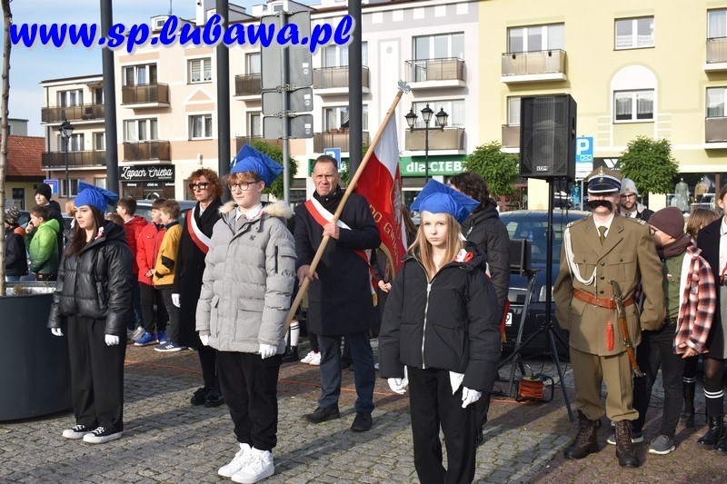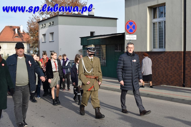 10 listopada w naszej szkole obchodziliśmy 105. rocznicę odzyskania przez Polskę niepodległości. Jest już tradycją, że uroczystości rozpoczęły się od wymarszu sprzed szkoły podstawowej o godzinie 10:40 społeczności szkolnej i flagi państwowej, której kierunek wytyczał poczet sztandarowy, uczeń (Nathaniel Wiśniewski) wcielający się w postać Józefa Piłsudskiego i harcerze. O godzinie 11:11 na lubawskim Rynku wspólnie ze zgromadzonymi mieszkańcami i władzami samorządowymi odśpiewano hymn państwowy.