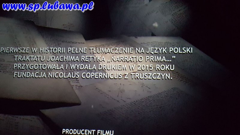 Miejsce przedpremierowego pokazu filmu nie jest przypadkowe. To właśnie na zamku biskupim w Lubawie Kopernik przebywał całe lato roku 1539. Tu toczył dyskusje z młodym matematykiem z Wittenbergi Joachimem Retykiem, zaś rolę gospodarza pełnił biskup chełmiński Tiedeman Giese, wieloletni przyjaciel astronoma. Wkrótce doszło w Gdańsku do publikacji „Narratio prima” autorstwa Retyka. Książka stanowiła przystępny opis zarysu teorii heliocentrycznej. Tuż przed śmiercią Kopernika, w drukarni Jana Petrejusa w Norymberdze, zostało wydane całe dzieło kilkudziesięcioletniej pracy astronoma, czyli „De revolutionibus orbium coelestium” (O obrotach sfer niebieskich). Teoria imiennika naszej szkoły przyczyniła się do prawdziwego przewrotu w nauce i poglądach człowieka na wszechświat epoki nowożytnej. Dzieło Kopernika, choć kiedyś znalazło się wśród ksiąg zakazanych, dziś zajmuje poczesne miejsce w światowym dorobku naukowym, czego dowodem jest jego wpisanie na listę UNESCO Pamięć Świata.