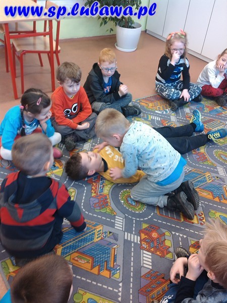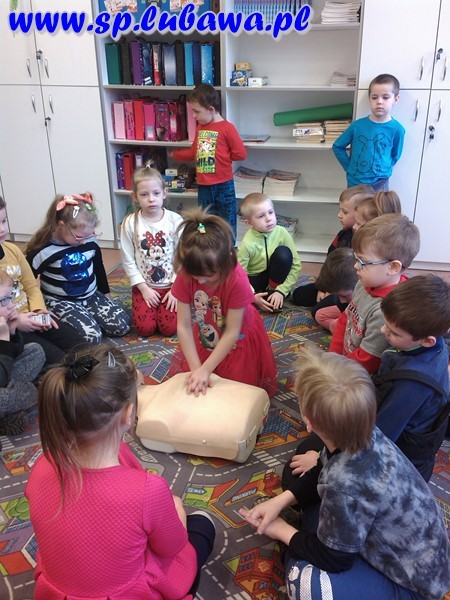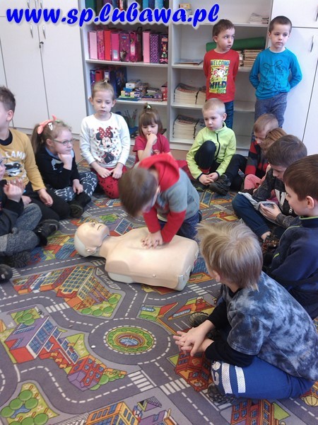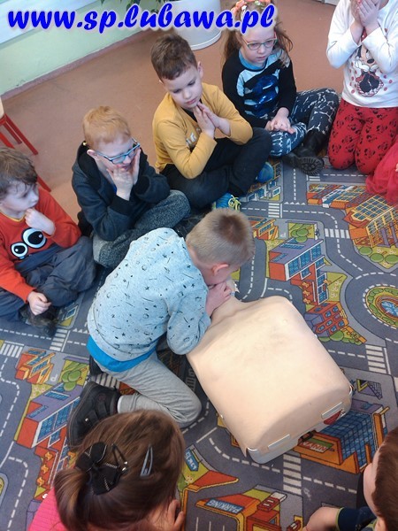 14 marca grupa sześciolatków , „Słoniki” z Przedszkola Miejskiego w Lubawie uczestniczyła w zajęciach Pierwszej Pomocy. Dzieci z dużą uwagą i zainteresowaniem słuchały opowiadania nauczyciela, uczyły się śpiewać piosenkę pt. „Znam numery alarmowe”, oglądały materiał video, kolorowały ilustracje, układały „poszkodowanego” w bezpiecznej pozycji oraz własnoręcznie wykonały telefony z tekturki za pomocą, których uczyły się wzywania pomocy. Ekscytującym zajęciem dla dzieci była możliwość prowadzenia ćwiczeń praktycznych, dotyczących resuscytacji krążeniowo- oddechowej z wykorzystaniem fantomu.