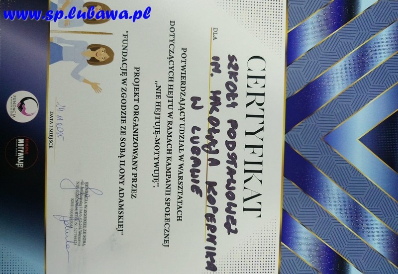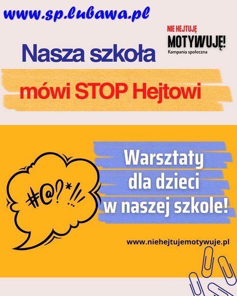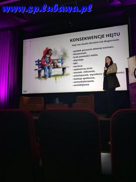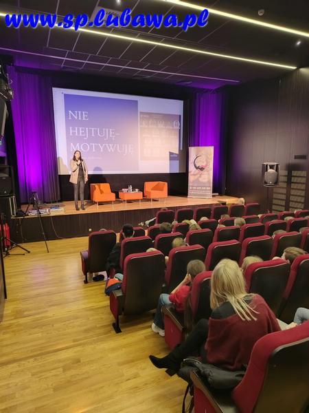 Starsze klasy uczestniczyły w spotkaniu profilaktycznym w ramach ogólnopolskiej kampanii społecznej „Nie hejtuję – motywuję”, które poprowadziła pani Ilona Adamska. Podczas wystąpienia prowadząca podzieliła się wieloma przykładami ze swojego życia oraz prawdziwymi historiami dzieci, które zmagały się z hejtem.