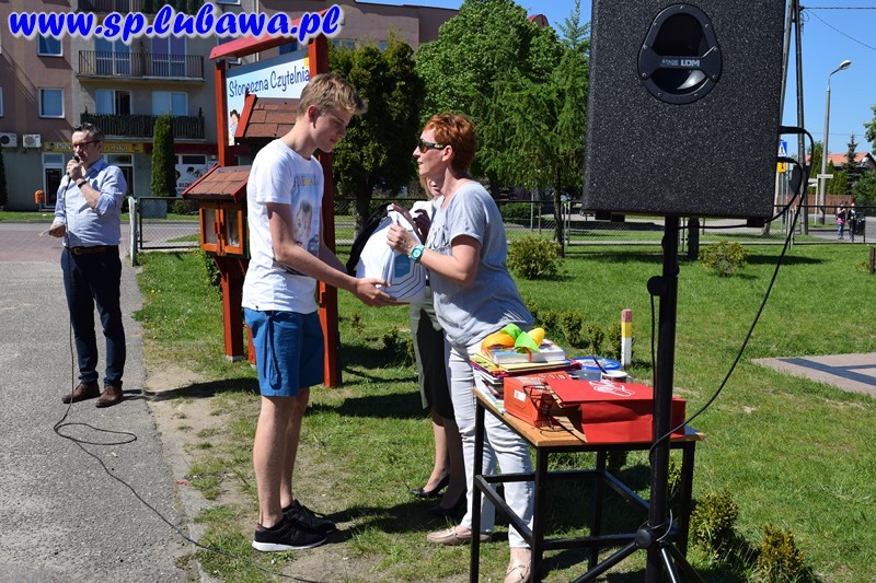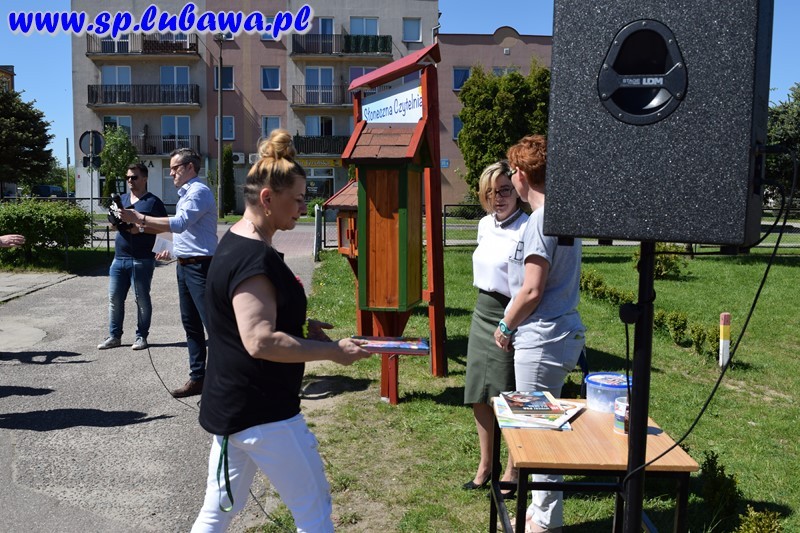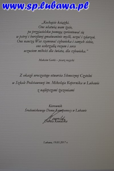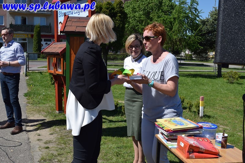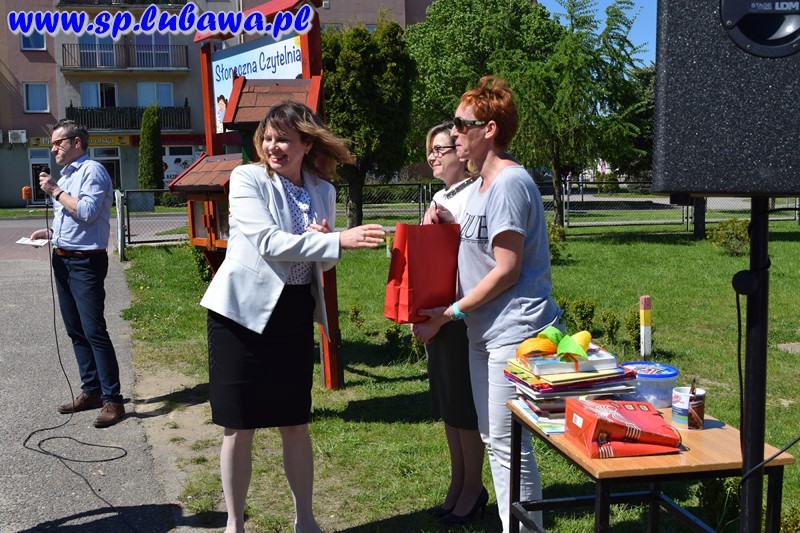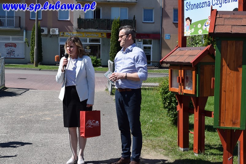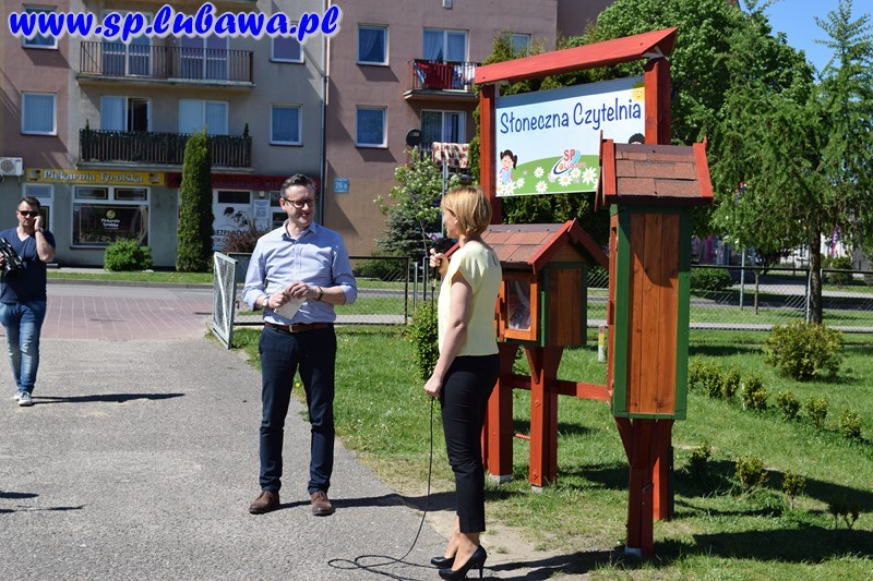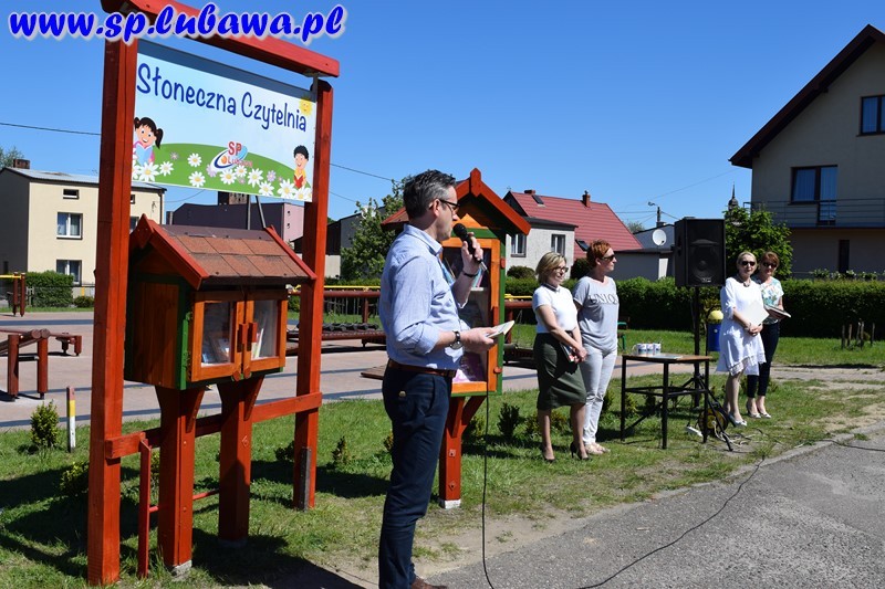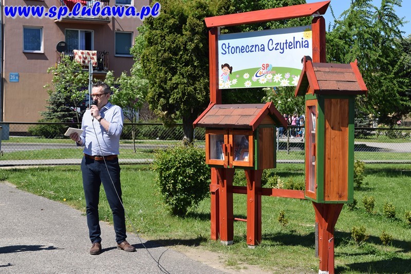 19 maja 2017 r. w naszej szkole odbyło się uroczyste otwarcie Słonecznej Czytelni. To kolejne przedsięwzięcie związane z czytelnictwem. Tym razem uczniowie i nauczyciele podarowali książki, które zostały umieszczone w czytelni pod chmurką. Inicjatywę dyrektora zrealizowały panie Beata Tarnowska, Gabriela Prusik i Agnieszka Hejda. Domki czytelnika zostały wykonane przez naszego nauczyciela Witolda Fafińskiego. Andrzej Kowalski, konserwator szkoły wykonał instalację czytelni. Dzisiaj swoją obecnością zaszczycili nas zaproszeni goście: sekretarz Urzędu Miasta p. Katarzyna Żuchowska, kierownik referatu ds. oświaty p. Robert Swat, dyrektor przedszkola p. Magdalena Pankowska, dyrektor żłobka p. Lucyna Janus, kierownik ŚDS p. Dorota Kowalska, kustosz Biblioteki Miejskiej w Lubawie p. Teresa Marchlewska oraz p. Aneta Nowakowska wraz z uczniami klasy II gimnazjum, którzy podarowali książki. Dyrektor szkoły p. Mirosław Kowalczyk dokonał uroczystego otwarcia oraz zachęcił obecnych do korzystania z czytelni. Podkreślił, że otwarcie zbiega się z kilkoma datami, m. in. śmiercią Mikołaja Kopernika, której rocznica przypada 21 maja, a także w maju zostało wydane dzieło astronoma O obrotach sfer niebieskich. Na uroczystości byli obecni uczniowie naszej szkoły, przedszkolacy wraz z wychowawcami oraz media.