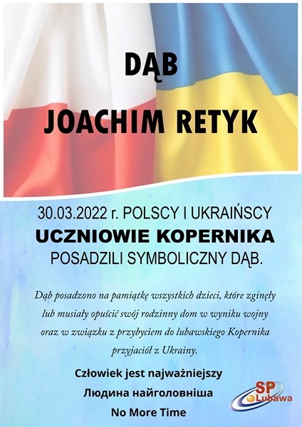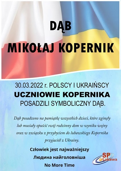 30 marca 2022 r. polscy i ukraińscy uczniowie Kopernika posadzili symboliczny dąb na pamiątkę wszystkich dzieci, które zginęły lub musiały opuścić swój rodzinny dom w wyniku wojny oraz w związku z przybyciem do lubawskiego Kopernika przyjaciół Ukrainy – taką informację możemy odczytać na tabliczkach umieszczonych obok dwóch dębów posadzonych przy budynkach szkół przy ul. Rzepnikowskiego i przy ul. Św. Barbary.